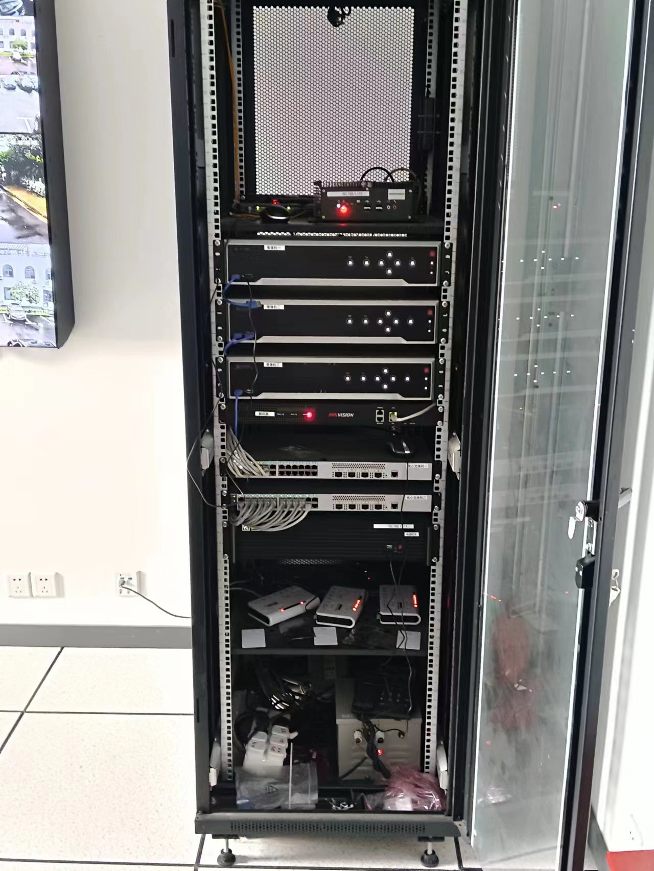 鑫丽电子科技公司项目图片,高档大气的网络机柜,4块46寸LED监控电视墙,高清数字网络监控解码上墙,UBS防拔插报警装置,给客户安心的智能化服务与售后服务。
